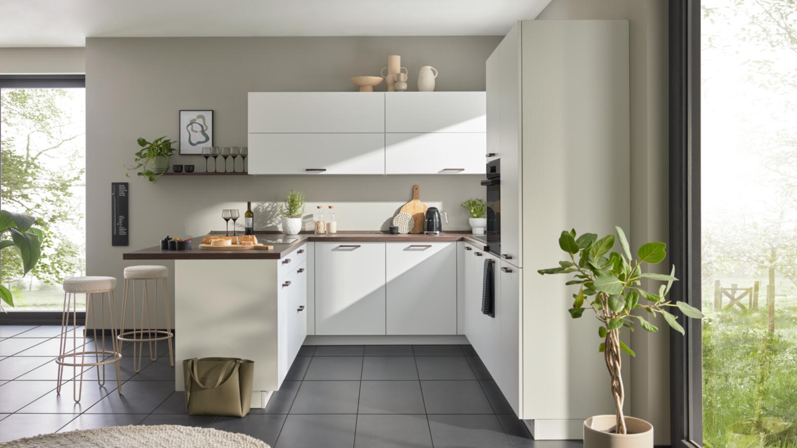 Offen und kommunikativ: Diese U-Küche verbindet Kochen, Essen und Miteinander. Smarte Auszüge, eine integrierte Thekenlösung und durchdachte Schrankideen sorgen für Komfort auf jedem Quadratmeter.
