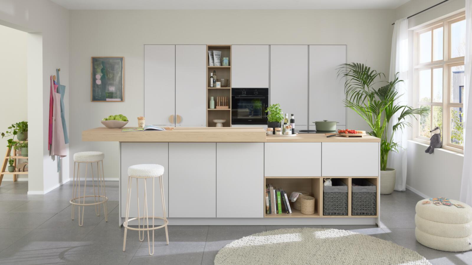 Platzsparend und kommunikativ: Die L-Küche mit integrierter Theke bietet Stauraum und clevere Lösungen auch für kleine Räume. Dank robuster Fronten und ergonomischer Planung eine rundum praktische Wahl.