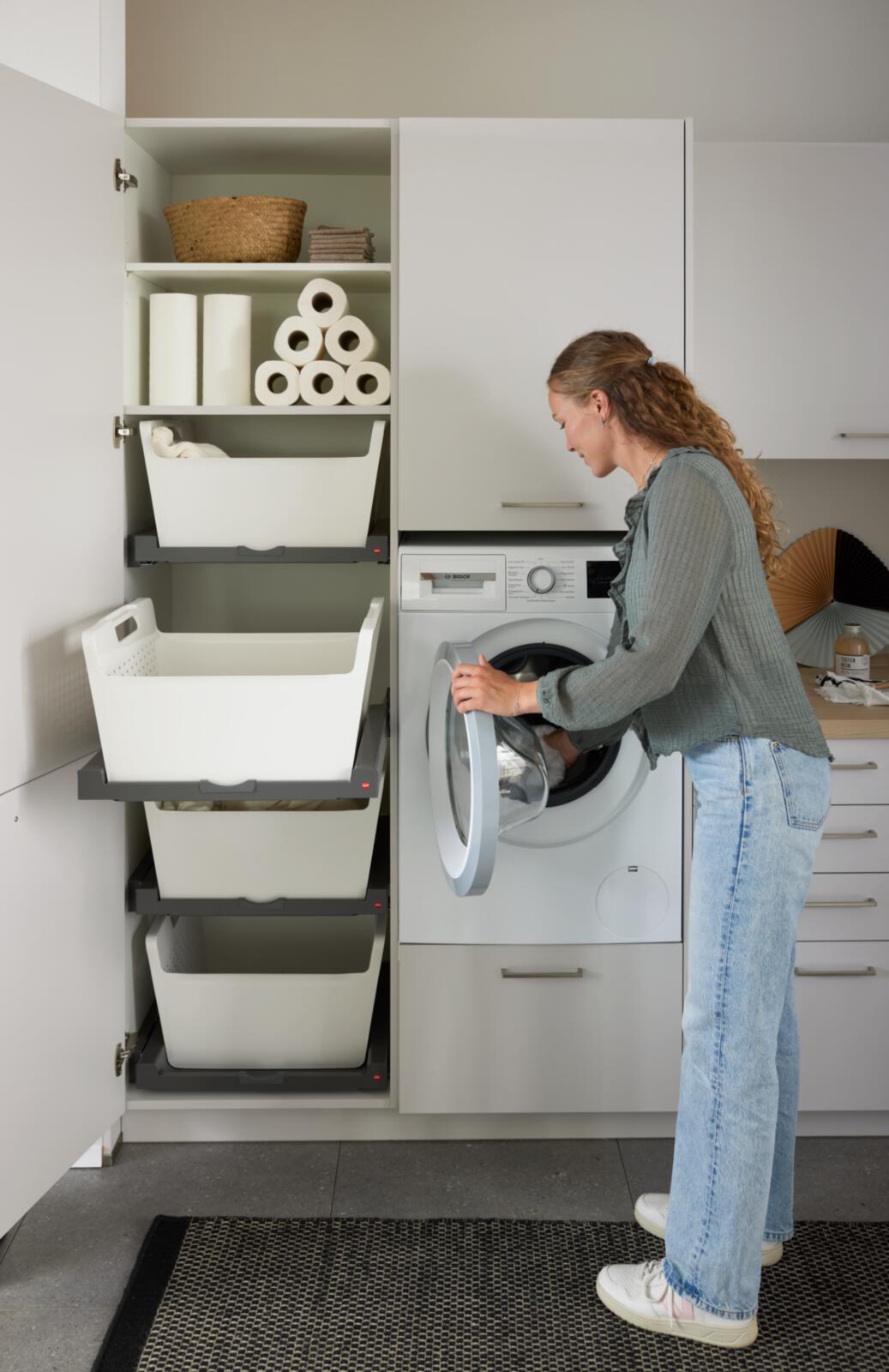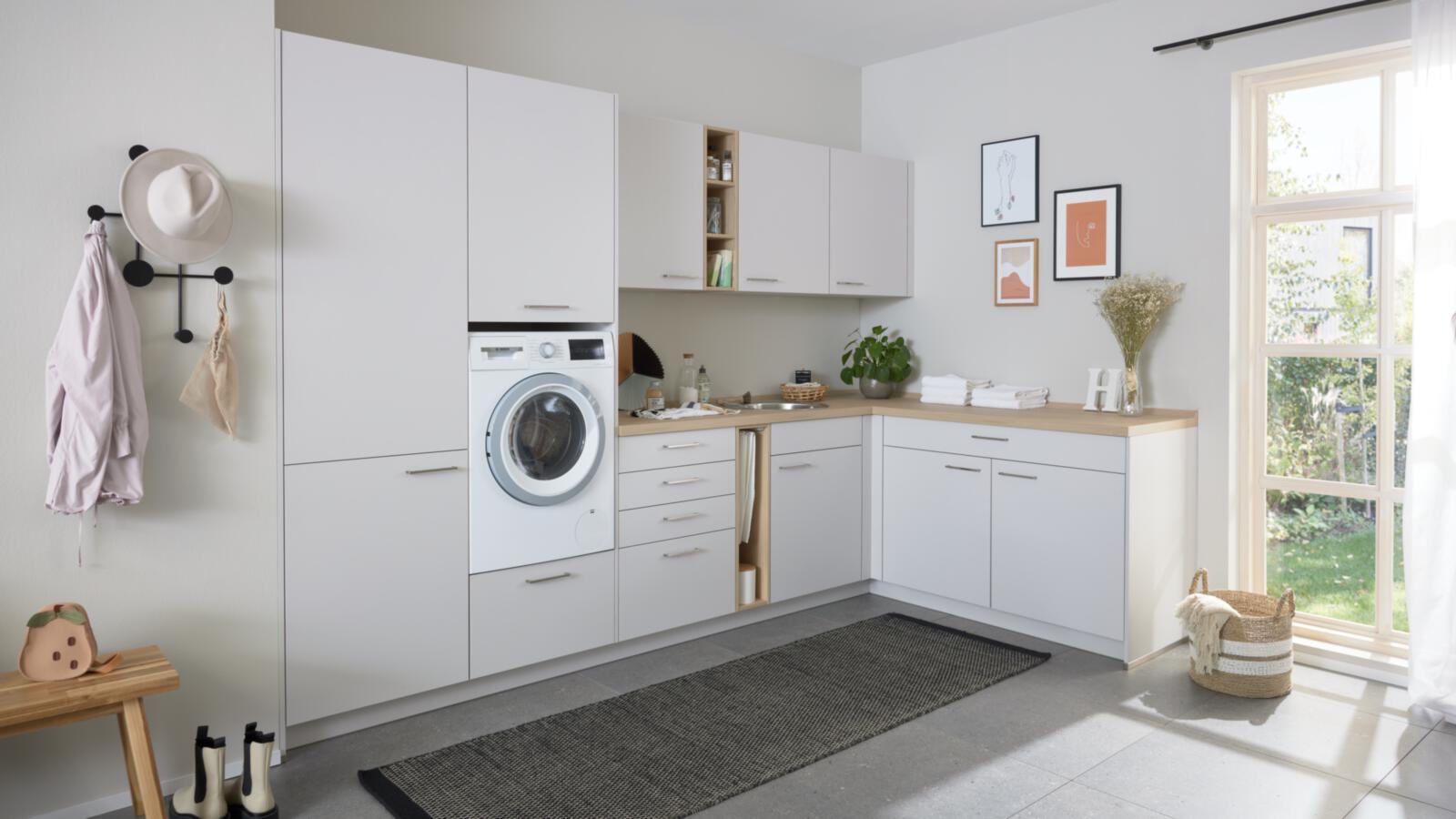 Ordnung leicht gemacht: Der Hauswirtschaftsraum bietet Platz für alles, was im Alltag wichtig ist. Ob Wäsche sortieren oder Stauraum für Schuhe – praktisch planbar im Look der Küche.