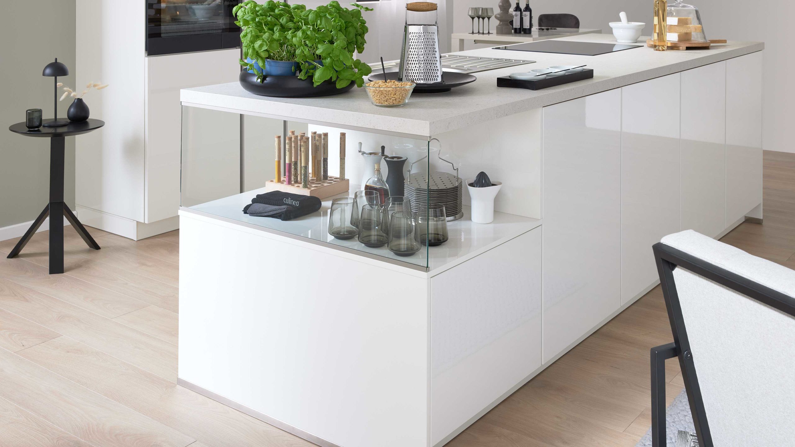 Die Culineo® Einbauküche C648 vereint zeitlose Eleganz mit moderner Funktionalität. Die weißen Hochglanz-Lacklaminatfronten mit edelstahlfarbenen Griffmulden und glänzend weißen Korpussen verleihen der Küche ein helles, klares Erscheinungsbild mit luxuriösem Touch. Die Arbeitsplatte in weißer Terrazzo-Nachbildung rundet das Design harmonisch ab und bringt eine moderne, mediterrane Leichtigkeit in dein Zuhause.