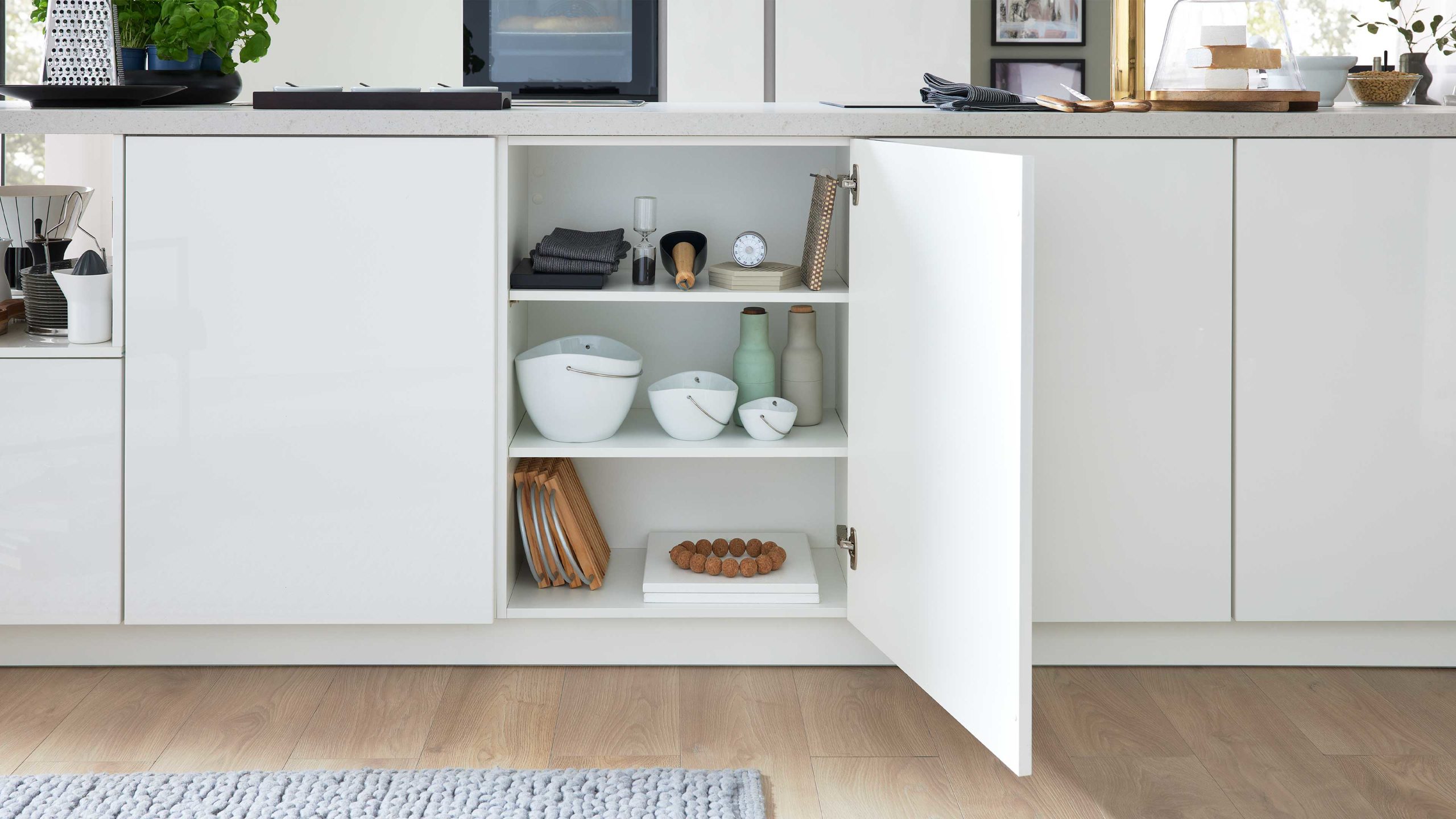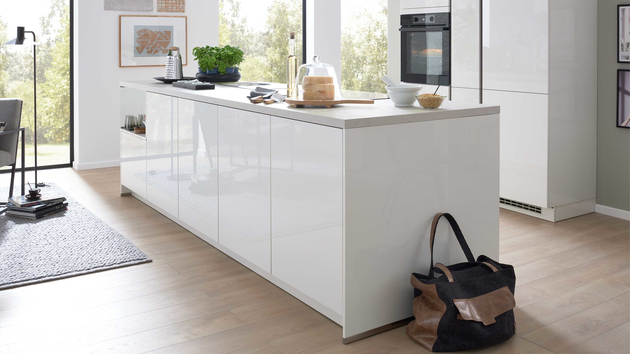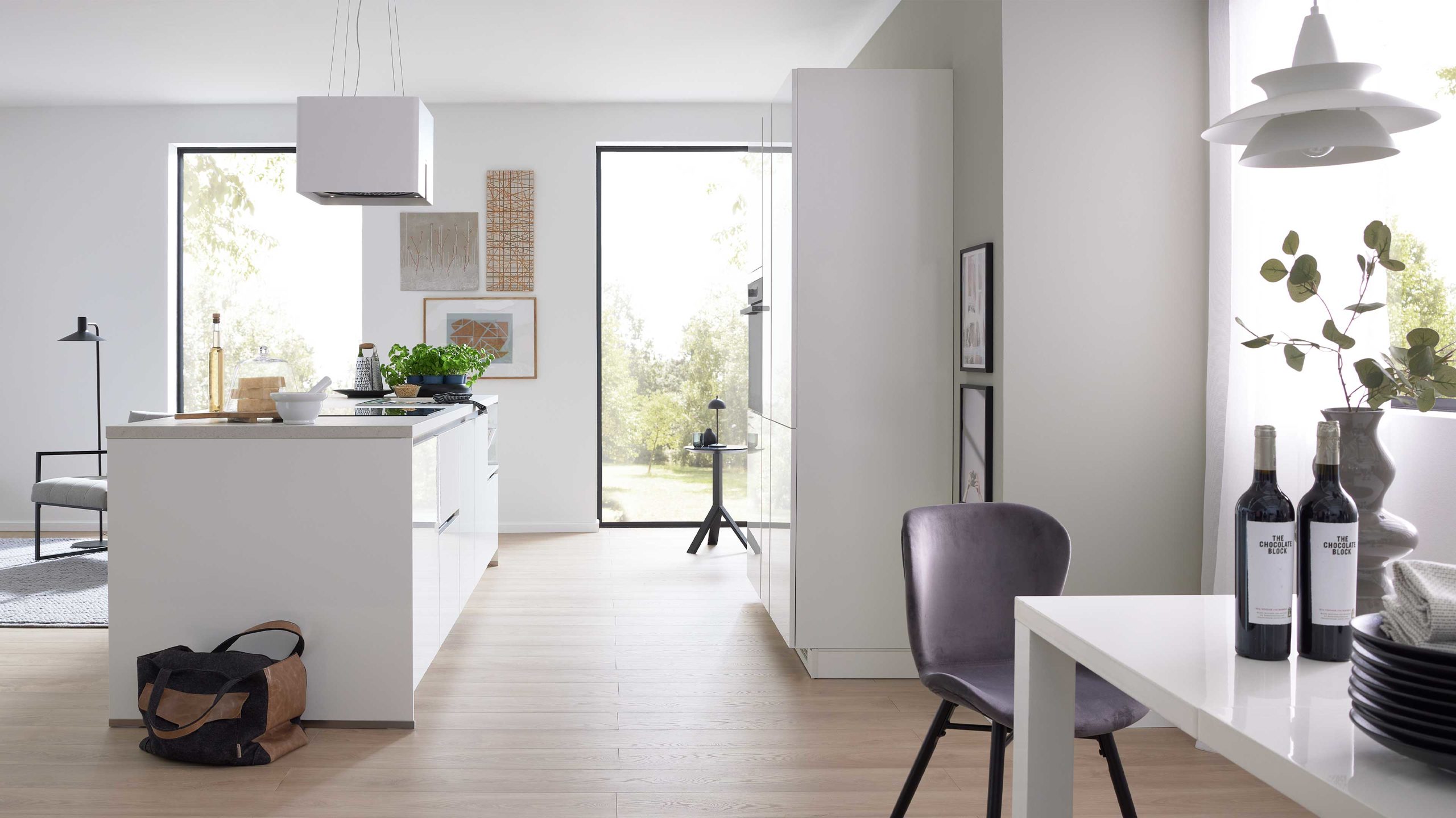 Für frische Luft beim Kochen sorgt der leistungsstarke Airforce Dunstabzug F181WH, der mit der Energieeffizienzklasse B (Spektrum A++ bis E) ausgezeichnet ist. Sein elegantes Design fügt sich nahtlos in das helle, moderne Gesamtbild der Küche ein.